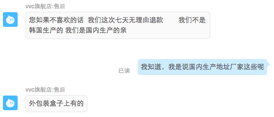 ▍產(chǎn)品標(biāo)簽首先,這家旗艦店銷(xiāo)售的 VVC 帽子是國(guó)內(nèi)生產(chǎn)并且銷(xiāo)售的,這個(gè)是客服的原話(huà):