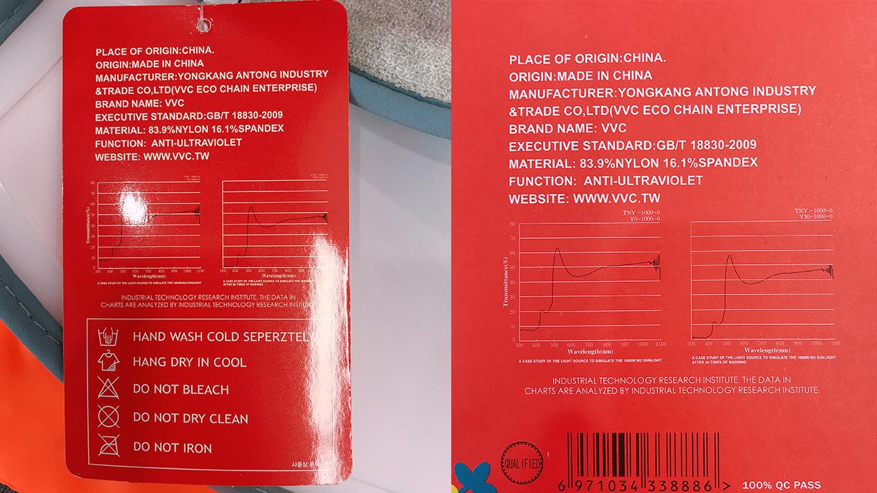 產(chǎn)品的吊牌上印有 UPF 40+ 的標(biāo)識(shí)和相應(yīng)的執(zhí)行標(biāo)準(zhǔn)。所以是合格的防曬產(chǎn)品,大家看的時(shí)候要注意看一下吊牌是不是和我拍的這個(gè)一樣。