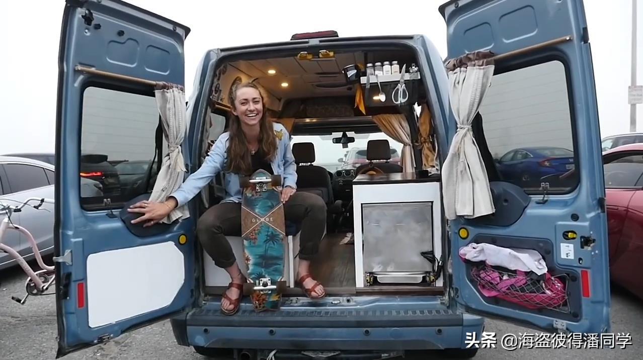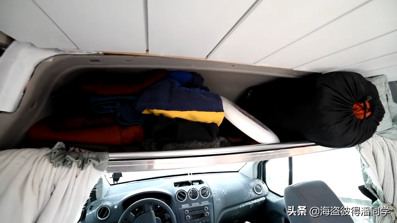 駕駛室頭頂做成了一個儲物空間,可以放平常高頻使用的墨鏡、帽子、還有墊子等等。儲物空間下沿可以掛窗簾。儲物空間就是加裝一塊鋁合金隔板,又便宜又輕。