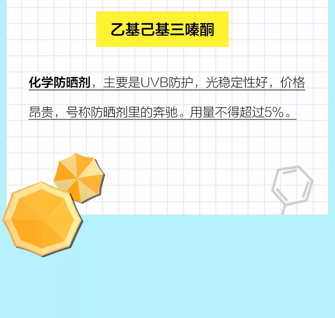 二苯甲酰甲烷、二苯甲酮、二甲基辛脂、對(duì)氨基芐酸、肉桂酸鹽、二羥基丙酮、苯酚類(lèi)。