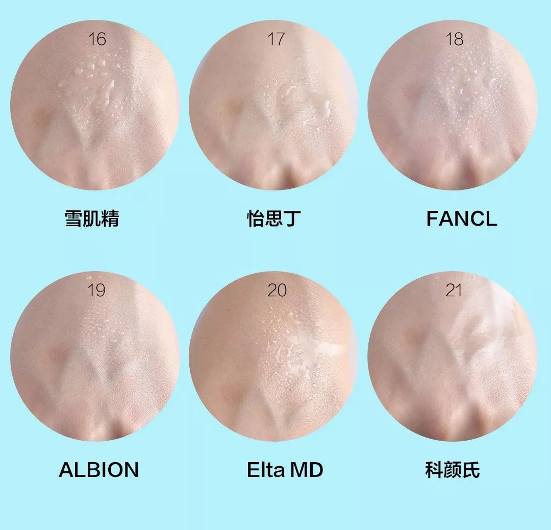 ?7.露得清:白色的乳液質(zhì)地,涂抹開(kāi)來(lái)白,吸收了一段時(shí)間后,肌膚上依舊有泛白感,遇水也有微微白色粉末泛出。