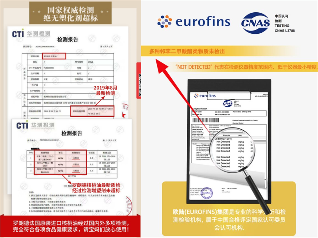 不過,這一檢測結(jié)果和羅朗德在商品宣傳時宣稱的“塑化劑檢測未檢出“有出入,其中原因,也不排除存在不同批次產(chǎn)品有波動的情況。