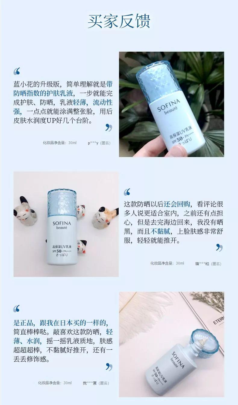 蘇菲娜“藍小花”跟其他防曬霜大的不同,就是一點都不油膩,質地輕薄,顏色自然,不浮白,不搓泥,清爽透氣,使用體驗棒。