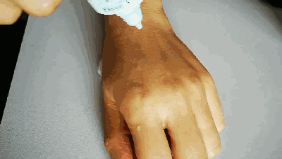 接下來,實驗人員讓測試人員抹上準備好的防曬霜,發(fā)現(xiàn)皮膚在鏡頭下也呈現(xiàn)黑色,這證明防曬工作真的很重要啊。
