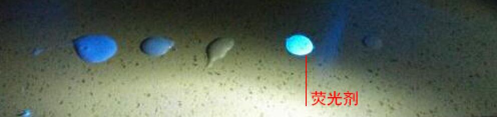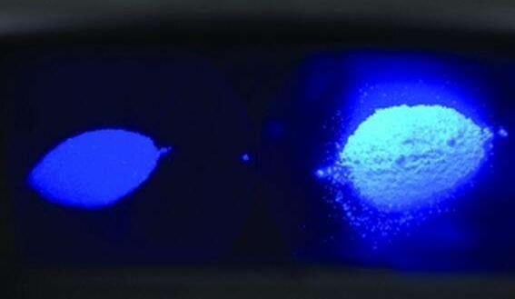 其實(shí),這樣的說(shuō)法不無(wú)道理,在紫外線下能發(fā)出熒光的成分不只有熒光劑,有些防曬劑、水楊酸等也會(huì)發(fā)熒光,但是可以區(qū)分的是,這類(lèi)成分發(fā)出的光很微弱(下圖右邊亮白色含熒光劑),而熒光劑石亮藍(lán)白色。
