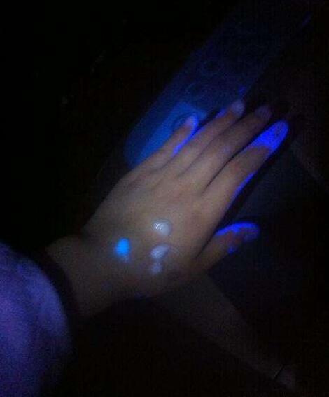在暗室中,用紫外線小手燈照射要檢驗(yàn)的化妝品,可以涂在手上,如果發(fā)現(xiàn)有藍(lán)白色的熒光就要高度懷疑了。