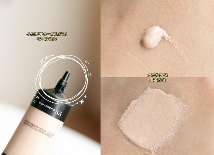這款粉底液的質(zhì)地是奶油狀的,細(xì)管擠壓頭貼心,容易控制擠出用量,不會(huì)浪費(fèi)。