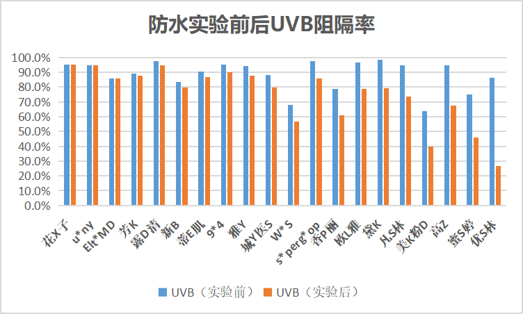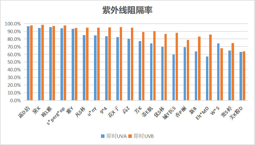 僅露D清、黛K、歐L雅、s*perg*op 、雅Y的防曬能力比較突出。