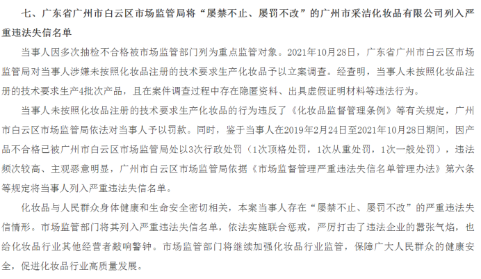 值得注意的是,2021年12月30日,市場監(jiān)管領域嚴重違法失信名單典型案例(第一批)公布,通報顯示,廣州市采潔化妝品有限公司因多次抽檢不合格,違法頻次較高、主觀惡意,存在“屢禁不止、屢罰不改”的嚴重違法失信情形,被列入嚴重違法失信名單。