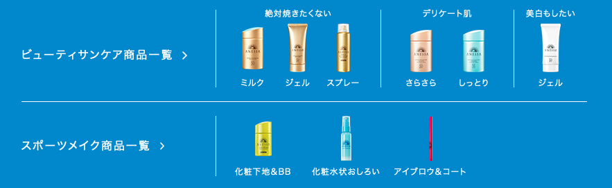 拿「ANESSA」來舉例說明,今年日本的產(chǎn)品線共有9款商品,分為美容防曬護理和運動化妝兩個系列。