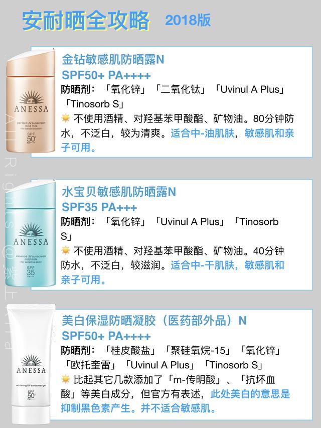針對想要美白的人群「ANESSA」推出了藥用美白款,添加抑制黑色素產(chǎn)生的傳明酸。但事實上,只要防曬做到位,就不會產(chǎn)生黑色素和色斑,除非你的膚色特別白皙,或肌膚的光敏性特別高。