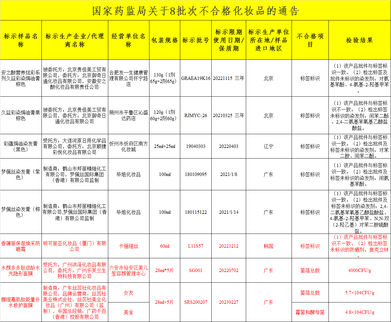 其中高達(dá)5批次為染發(fā)類產(chǎn)品,均涉及標(biāo)簽標(biāo)識(shí)不合格,具體包括:朔州市平魯區(qū)沁盛達(dá)藥店銷售的、標(biāo)稱北京御奇日通化妝品有限公司委托北京貴佳美工貿(mào)有限公司生產(chǎn)的久益彩染焗油膏栗棕色,以及北京御奇日通化妝品有限公司、安徽安之酸化妝品有限責(zé)任公司委托北京貴佳美工貿(mào)有限公司生產(chǎn)的安之酸營(yíng)養(yǎng)炫彩系列久益彩染焗油膏棕色等等。
