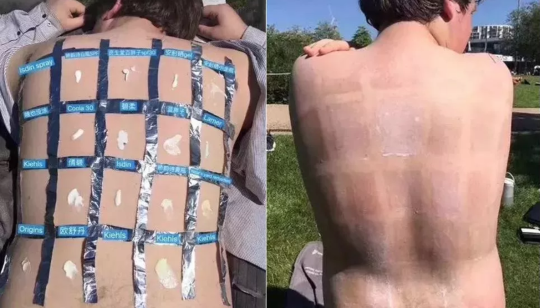 這是一個(gè)防曬測(cè)試,一開(kāi)始只是為了測(cè)試防曬霜的果。兩小時(shí)后,大部分皮膚都有被曬傷的情況。