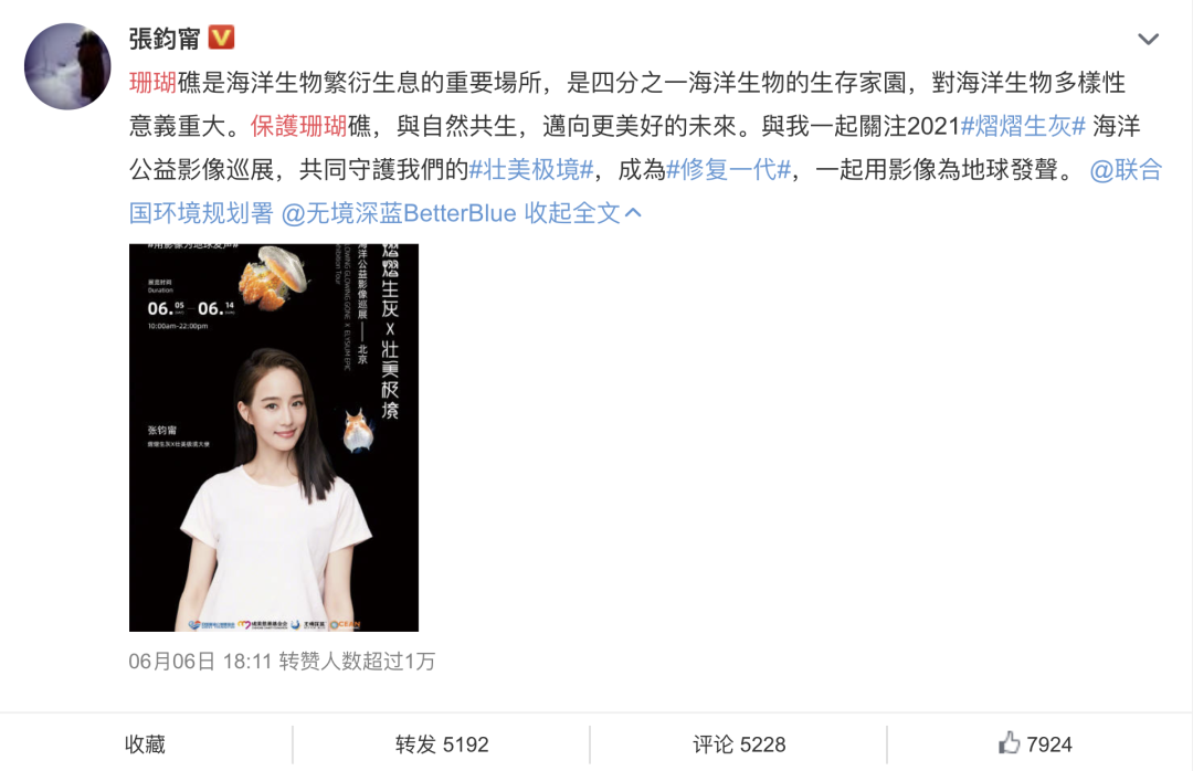 一向?qū)Wh(huán)保的戶外達人張鈞甯也積極地參與到守護珊瑚礁的活動中去。