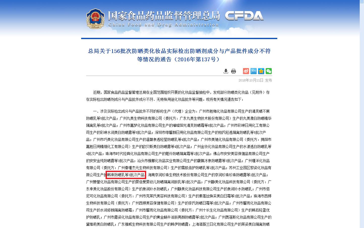 2016年10月11日,總局發(fā)布了關(guān)于156批次防曬類化妝品實(shí)際檢出防曬劑成分與產(chǎn)品批件成分不符等情況的通告(2016年第137號),其中三種韓束防曬產(chǎn)品均因?yàn)闄z測出該有成分和檢查出標(biāo)簽沒有的成分被通報(bào)。