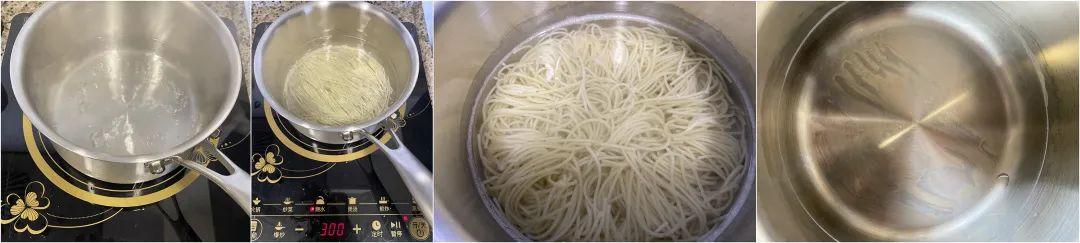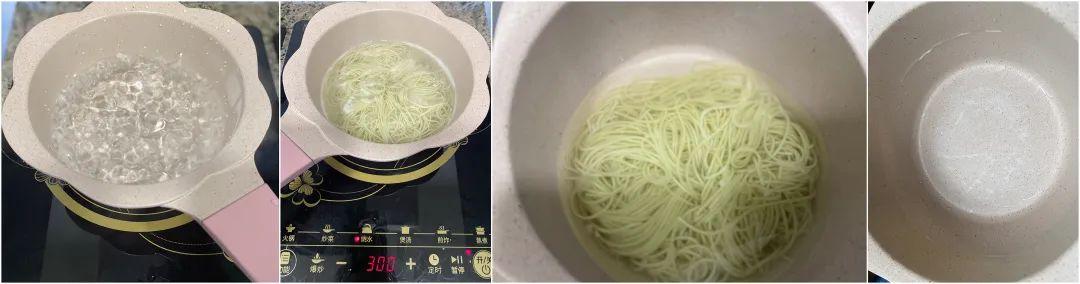 b)煮5分鐘后關閉電磁爐,倒出面條,觀察面條是否粘底。是否容易用清水清洗干凈。