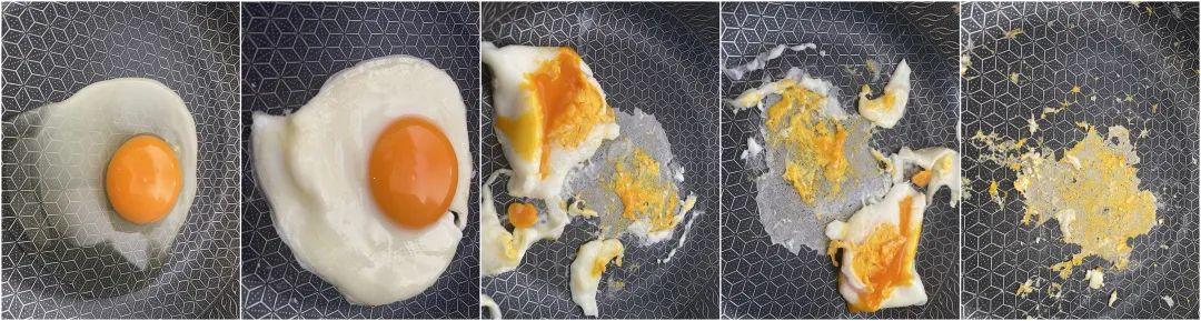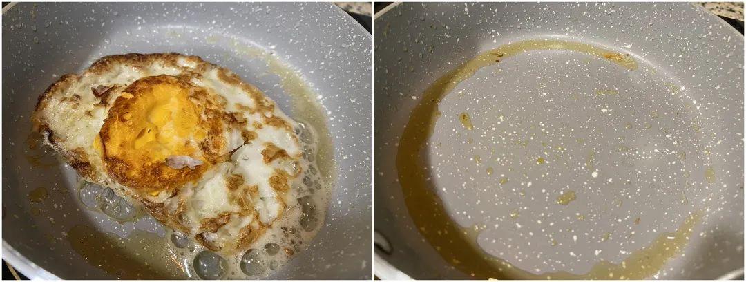 在無油煎蛋過程中,蘇泊爾的不粘底表現是好的,而有油煎蛋情況下,蘇泊爾煎鍋完全不粘底。