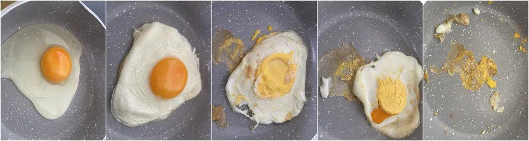 b)記錄雞蛋貼近鍋底的蛋白完全凝固的時間(可以評估煎鍋的導熱性)。整個雞蛋的蛋白幾乎徹底凝固且雞蛋表面以及邊上開始出現紙片狀薄膜的時間,然后將雞蛋翻面,觀察是否粘鍋,以及雞蛋徹底煎熟所需要的時間。同時,分不同時間段(煎蛋1分鐘、5分鐘、10分鐘、徹底熟蛋的時間)拍下雞蛋的情況。