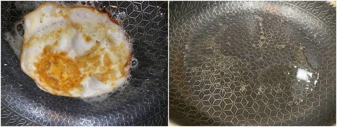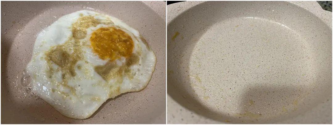無油煎蛋出現的粘鍋情況,經水浸泡五分鐘,3款煎鍋的粘底部分都很容易清洗掉。