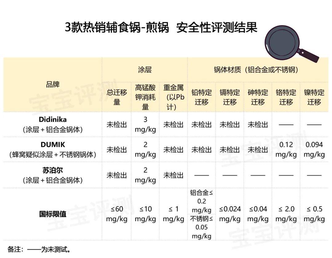 3款煎鍋均未檢出總遷移量和重金屬鉛,但均測試出高錳酸鉀消耗量。其中,Didinika的為3mg/kg,略高于DUMIK和蘇泊爾的2 mg/kg,不過,都小于國標要求的10mg/kg,沒有健康風險。