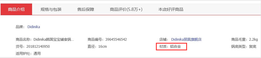 Didinika在產品名稱里雖然宣稱是麥飯石不粘鍋,但細看商品詳情頁,涂層寫的卻是“火山巖涂層”,材質用小字標注的是“鋁合金”,真是謎一樣的操作方式。