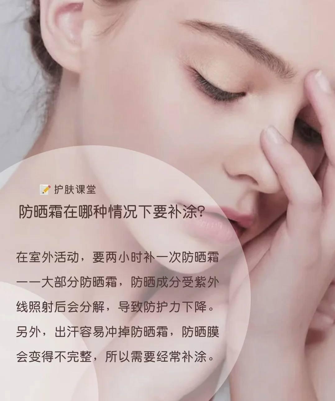 涂完后出門補(bǔ)涂防曬霜也是一個(gè)很重要的事情。特別愛護(hù)自己的皮膚的人,在戶外活動(dòng)時(shí),每兩個(gè)小時(shí)補(bǔ)涂一次防曬霜為佳。