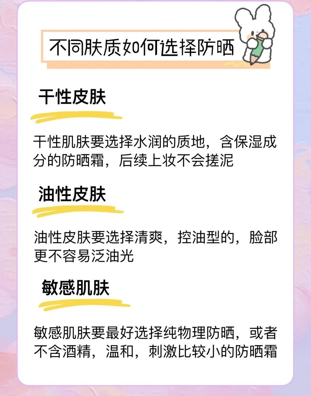 所以如果要經(jīng)常涂抹防曬霜的女士,記得選準(zhǔn)適合自己的防曬霜:敏感肌選擇市面上主打溫和的,油皮選干爽清透型,干皮多用滋潤養(yǎng)膚型。