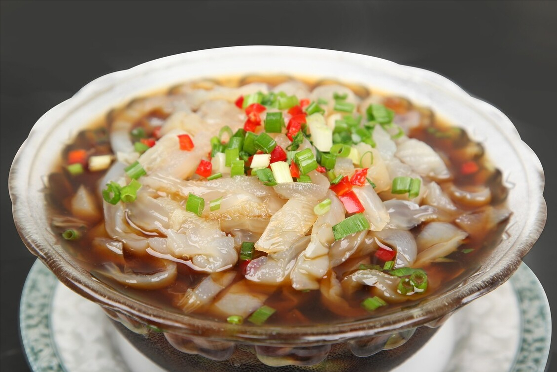海蜇粉海蜇粉,聽到名字很多人會認為里面只有粉和海蜇,但當海蜇面端出來的時候,很多人都被碗里的其他配料感到驚訝。要制作海蜇粉,必須選擇海蜇的觸須部位,這里的肉質(zhì)較厚,營養(yǎng)豐富,海蜇面除了粉絲和海蜇兩大主料外,還配有鯖魚、梭魚、鯔魚等各式魚糕和還有一些大塊的魚肉。