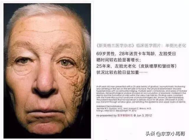 好多寶寶應(yīng)該都看過(guò)這張圖吧,這是一位司機(jī)的臉,圖右的臉靠著車(chē)窗,長(zhǎng)期接觸紫外線,后導(dǎo)致圖右臉看起來(lái)要比圖左臉老了十歲!
