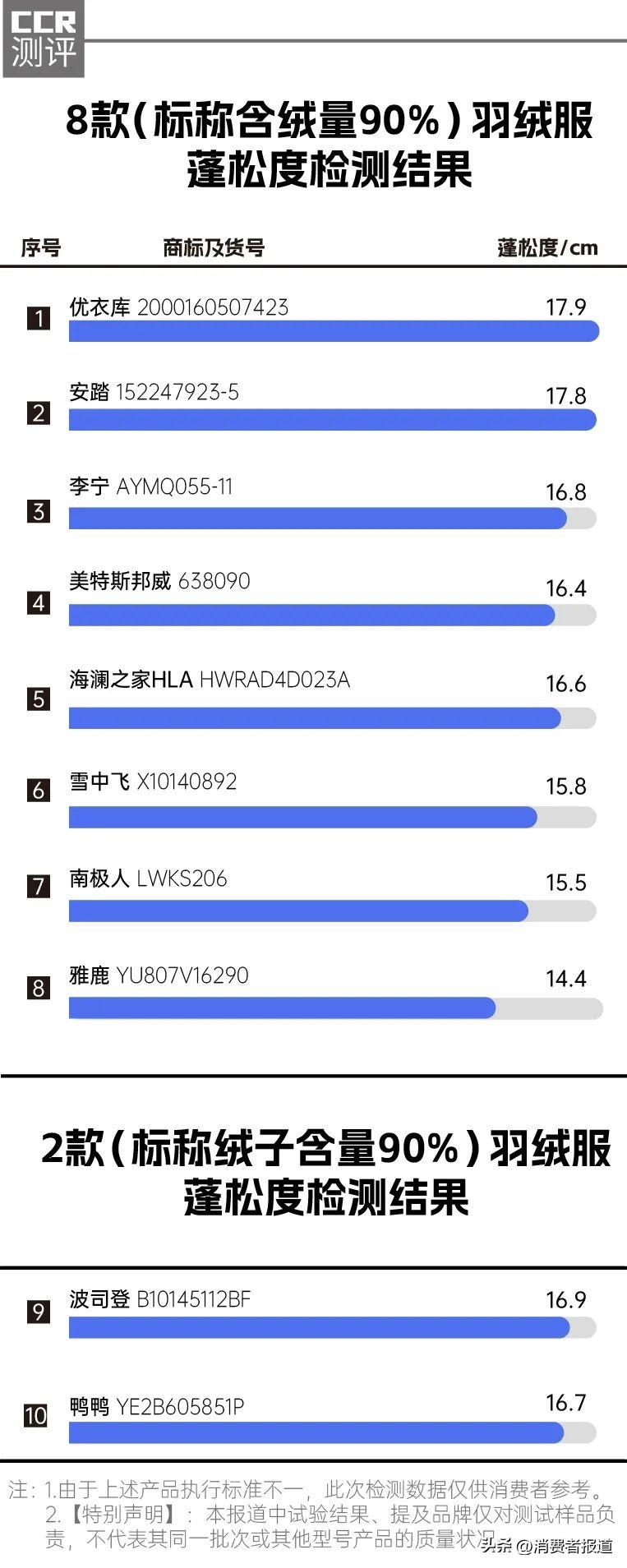 此次檢測的10款羽絨服均為鴨絨,結(jié)果顯示,優(yōu)衣庫、安踏蓬松度高,分別高達17.9cm和17.8cm,而南極人、雅鹿差強人意,僅為15.5cm和14.4cm。