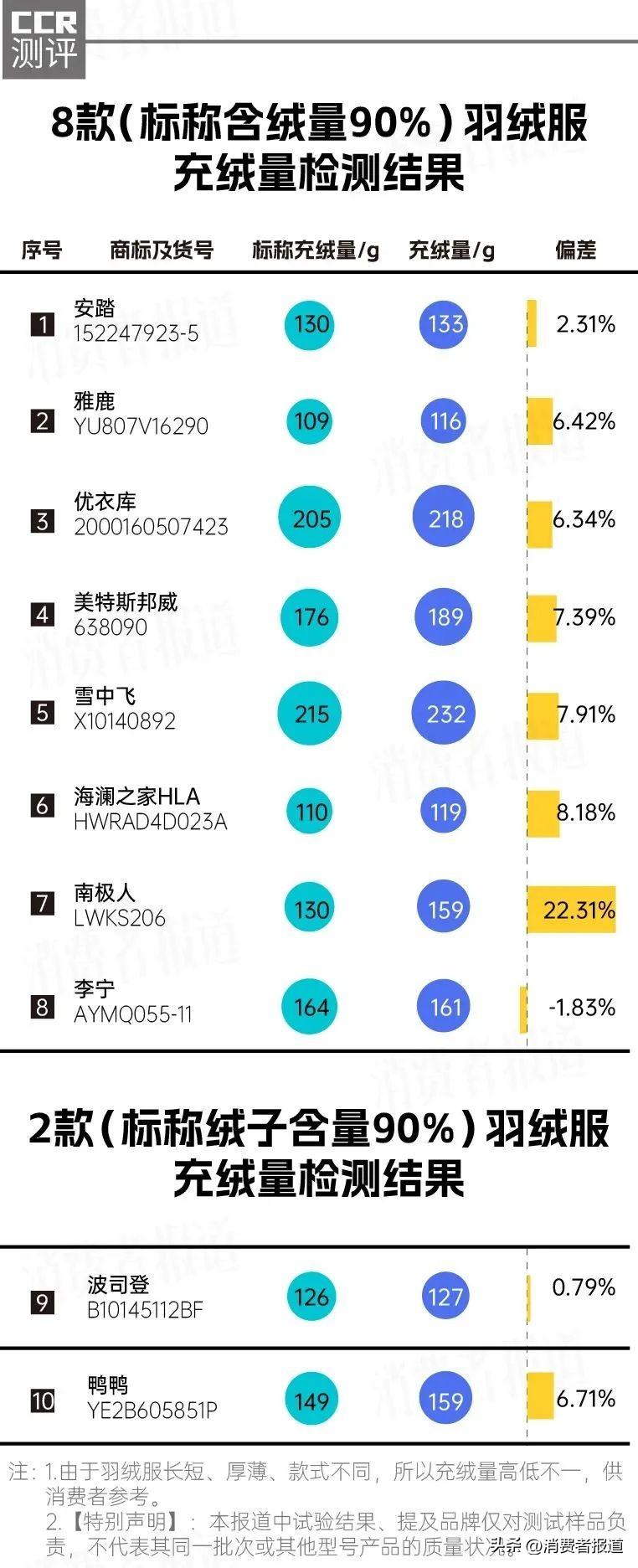 結(jié)果顯示,10款羽絨服的實測充絨量均符合標準要求,消費者可放心使用。
