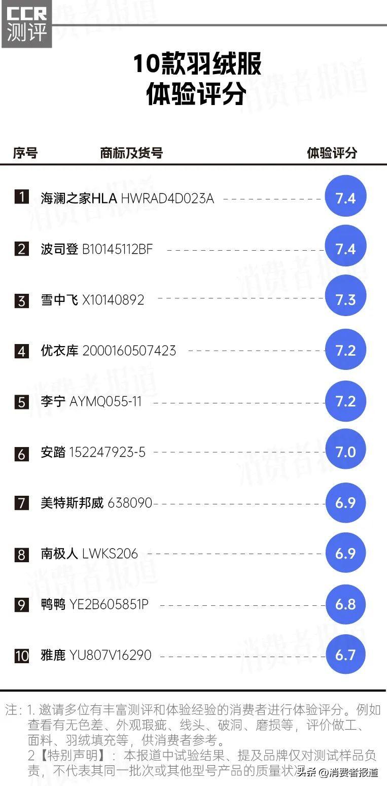 2022年12月,《消費者報道》隨機選購了市面上較熱銷的10款羽絨服進行多項測試,品牌包括優(yōu)衣庫、安踏、李寧、美特斯邦威、海瀾之家HLA、雪中飛、南極人、雅鹿、波司登、鴨鴨。