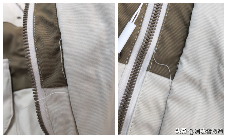 其中美特斯邦威 638090有的鉆絨現(xiàn)象,如下圖,在拉鏈處、袖口處均有羽絨鉆出,及不美觀,也影響穿著,長期還影響保暖性能。腋下還有長長的線頭。