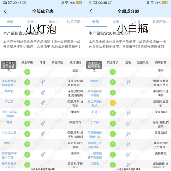 從成分上看,小燈泡含有的美白成分和小白瓶含有的美白成分是一樣的