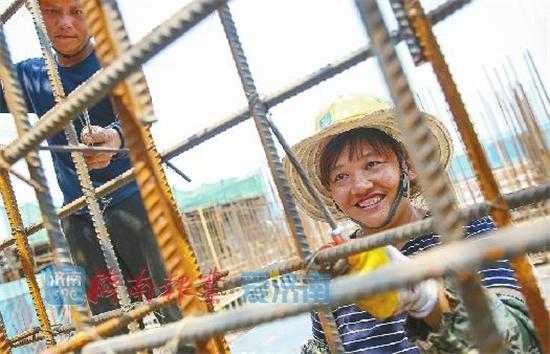 剛剛?cè)敕?,濟南就迎來一輪高溫熱浪?月19日早上5點多,在省腫瘤醫(yī)院中建一局項目工地上,41歲的貴州桐梓人梁大賢上工了。為了不再兩地分居,孩子大了點后,她把兩個孩子托付給老人照看,自己跟著丈夫入了建筑這一行,今年是她干建筑的第十個年頭。迎著朝陽,梁大賢和丈夫靠兩條腿爬到12層樓頂,他們要趁著早上涼快多干點活,下午天熱就可以早下工休息。