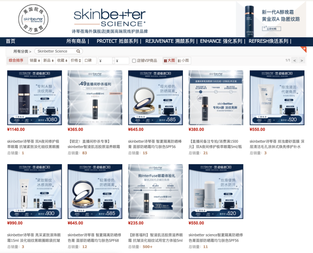 在Skinbetter Science詩(shī)琴蓓天貓國(guó)際海外旗艦店(粉絲數(shù)2000+)中,該品牌共上架了「智御Alto抗氧修護(hù)精華」、「修色臻白粉金精華」、「雙A復(fù)顏修護(hù)晚霜」、「智夏隔離防曬修色膏SPF68」等17個(gè)新品,涵蓋精華、面霜、眼霜、防曬、潔面、涂抹面膜等品類,單品券后價(jià)位在305-1430元不等。