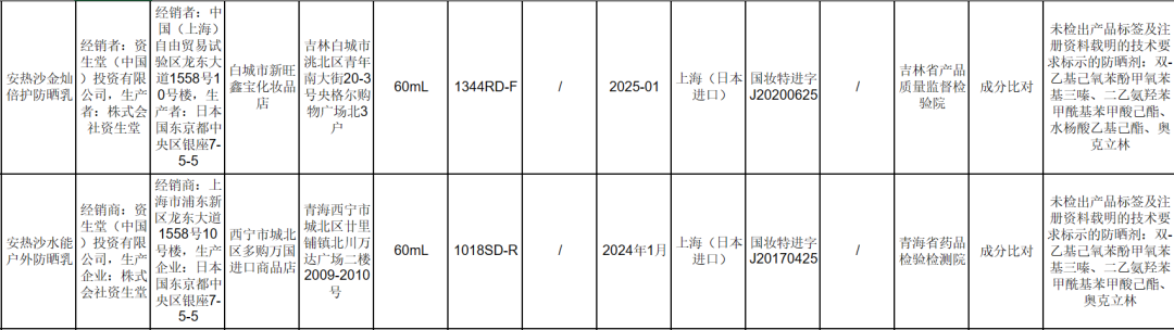 此次通報(bào)顯示,生產(chǎn)者為株式會(huì)社資生堂的“安熱沙金燦倍護(hù)防曬乳”、“安熱沙水能戶(hù)外防曬乳”均未檢出產(chǎn)品標(biāo)簽及注冊(cè)資料載明的技術(shù)要求標(biāo)示的防曬劑。