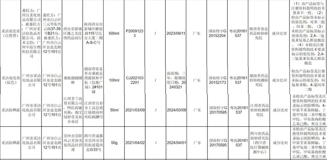 此次,廣州市采潔化妝品有限公司(以下簡(jiǎn)稱(chēng):廣州采潔)旗下的兩款染發(fā)膏及防曬霜均因成分對(duì)比不合格,被藥監(jiān)局通報(bào)。