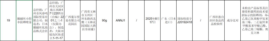 公告顯示,日本娜麗絲化妝品株式會(huì)社生產(chǎn)的“娜麗絲小陽(yáng)傘防曬噴霧”,因未檢出產(chǎn)品標(biāo)簽及注冊(cè)資料載明的技術(shù)要求標(biāo)示的防曬劑,被藥監(jiān)局列為不合格產(chǎn)品。