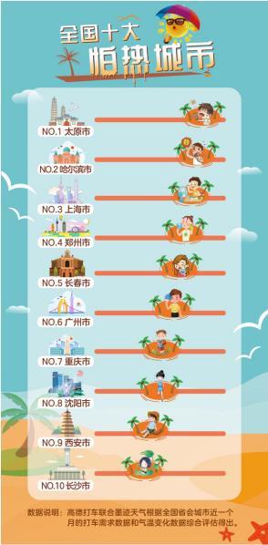 “全國十大怕熱城市”中,怕熱的城市是太原,氣溫每升高1℃,打車需求漲幅高。第二名是哈爾濱,第三名則是上海。前三甲中有兩個是北方城市。