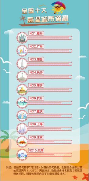 自大暑至24日的三天內(nèi),全國省會城市中出現(xiàn)高溫天氣的天數(shù)多的分別是,福州、廣州、南昌、長沙、南寧,三天均將出現(xiàn)高溫天氣,杭州、重慶、上海將出現(xiàn)兩天高溫天氣,北京、天津則為一天。這十大高溫省會城市中,廣州、長沙、重慶、上海均在“全國十大怕熱城市”之列。