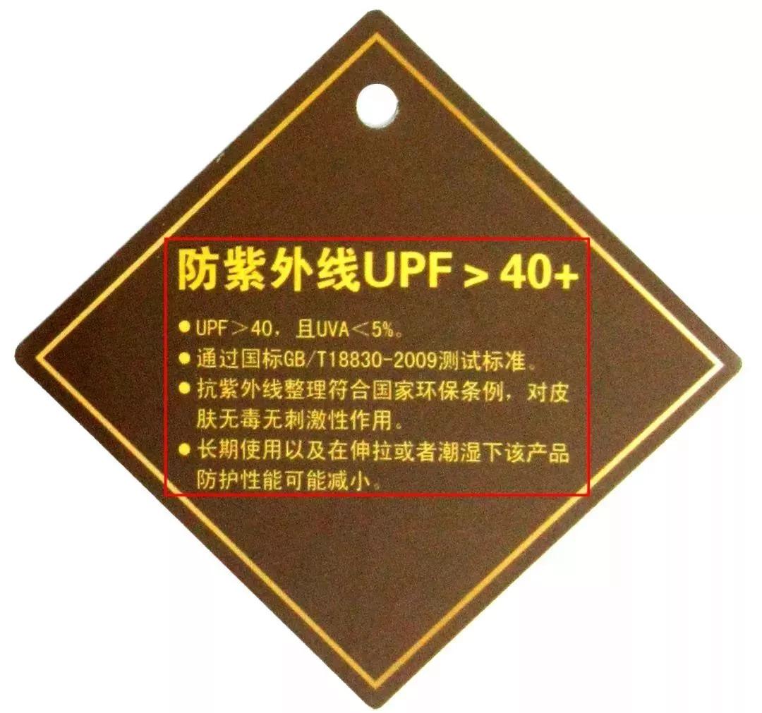 實(shí)體店選購防曬衣時(shí)不要輕信銷售員的介紹,要看標(biāo)簽上的UPF值,UPF值越大防紫外線果越好。UPF值一般標(biāo)識(shí)40+或者50+兩種,低于40+的不能作為防曬衣穿著。正規(guī)廠家生產(chǎn)的防紫外線產(chǎn)品一般會(huì)在標(biāo)簽上標(biāo)示有: