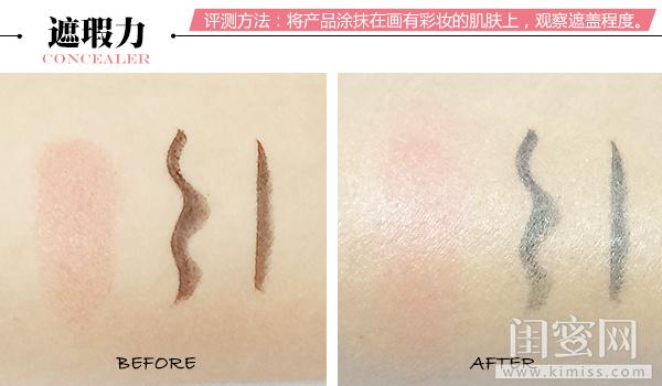 在涂有防水眼線筆和唇膏的手臂上,按壓涂抹1層波斯頓男士氣墊BB霜,能的看到唇膏的幾乎完全被遮蓋,眼線筆也被遮蓋掉許多,可見遮蓋面部的斑點(diǎn)是沒有問題的。