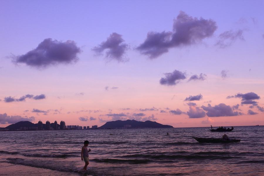 傍晚時(shí)分,我們回到 三亞 灣準(zhǔn)備看日落,這的 是 三亞 適宜觀賞日落的地方。二十里長(zhǎng)的 濱海 大道椰樹(shù)成林,日落時(shí)分,紅霞滿天,樹(shù)影搖曳,海風(fēng)習(xí)習(xí),很美、很靜謐。這么美的夕陽(yáng)也是要趕對(duì)時(shí)候才欣賞的到,有不少時(shí)間因?yàn)轱L(fēng)、雨、云的影響會(huì)看不到這雄渾日落。我們很幸運(yùn),沒(méi)有在旅游高峰期來(lái)這里,否則熙熙攘攘的游客會(huì)讓這份自然美景失色不少。