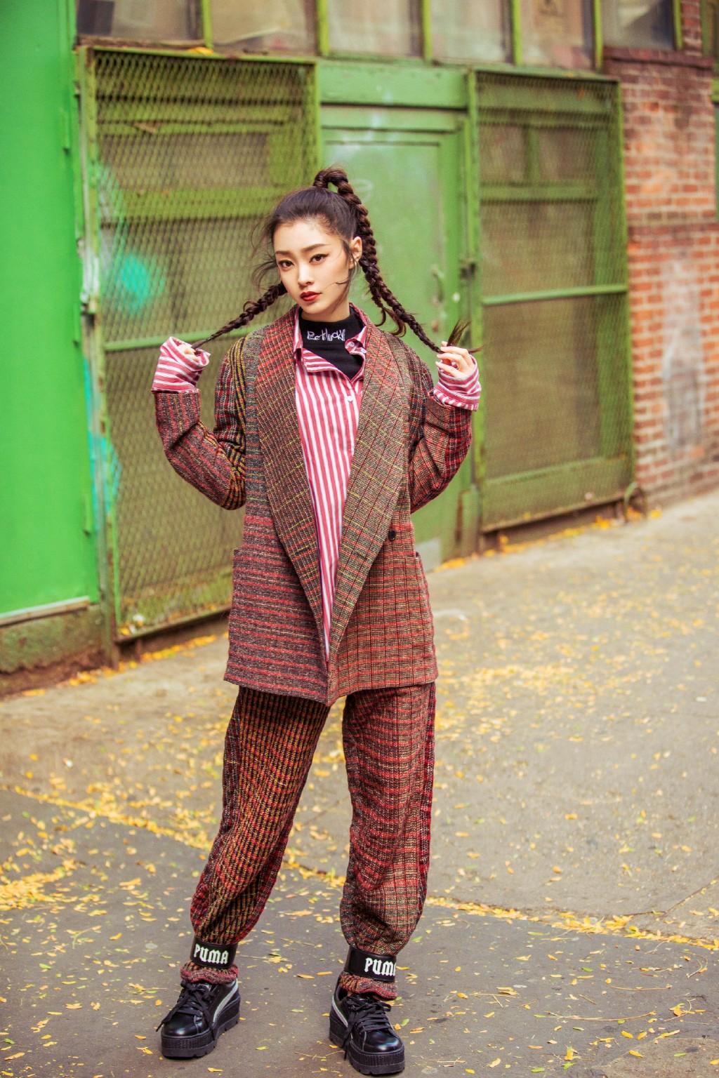 宋軼外穿格紋拼接西裝,復古有型,內(nèi)搭條紋襯衫,時髦個性,搭配麻花辮減齡不少,踩上一雙黑色厚底鞋,露出帶狂傲不羈的眼神,帶來“大姐大”的既視感!