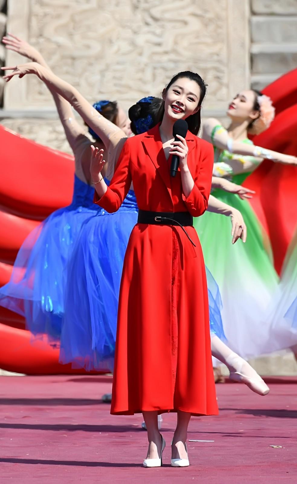 穿上大紅色連衣裙的宋軼,明艷動人,西裝領子的設計,簡單大氣,系上一條黑色腰帶,紅黑撞色的穿搭,既摩登又充滿時尚感,隨便一站,美成時尚畫報。