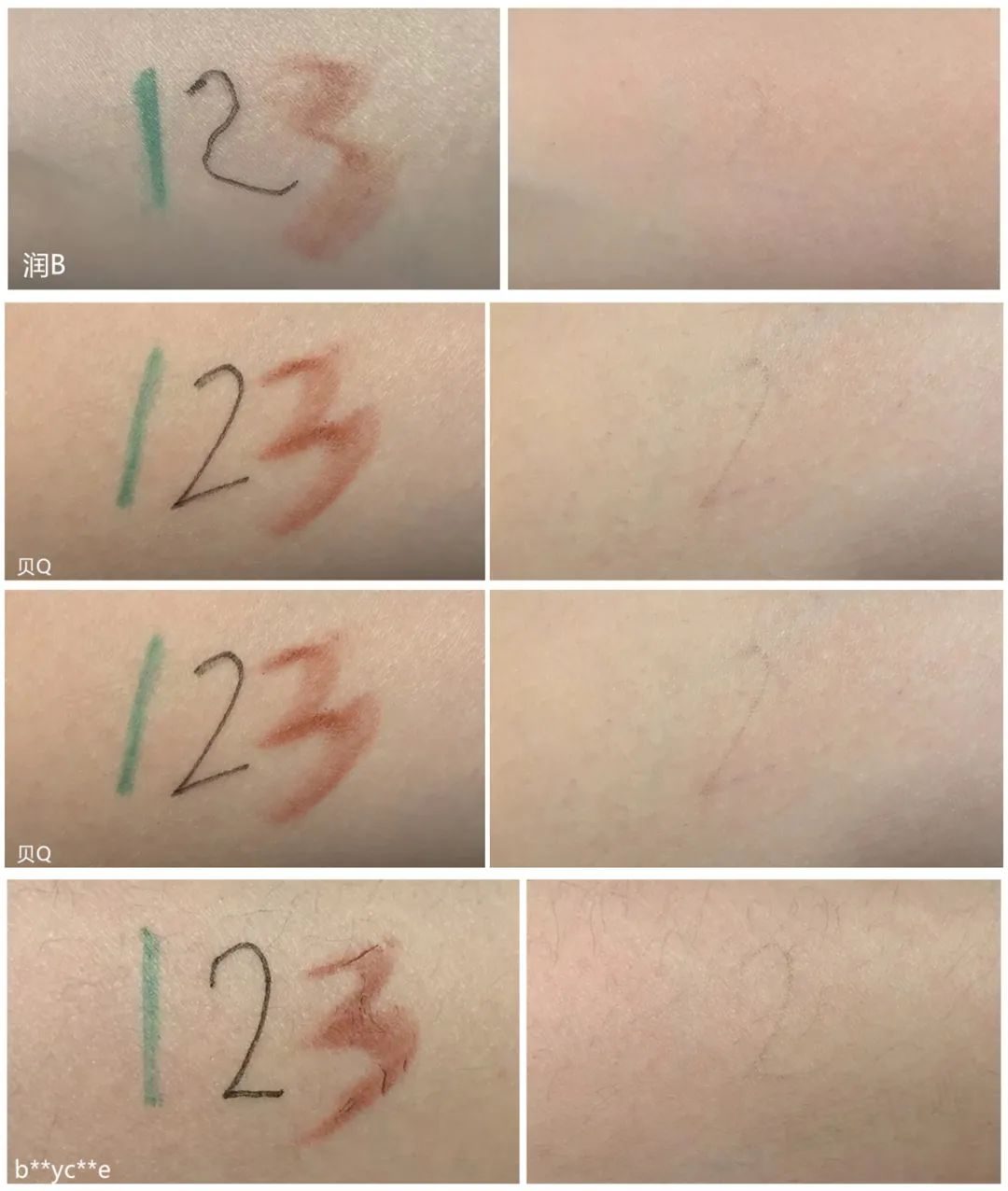 ②用綠/黑/棕三色的水彩筆/簽字筆/蠟筆,在手臂上分別寫1/2/3,靜置5分鐘,取各款樣品0.2g,揉搓20次,再用清水沖洗30秒,擦干后比較手臂上的筆跡。