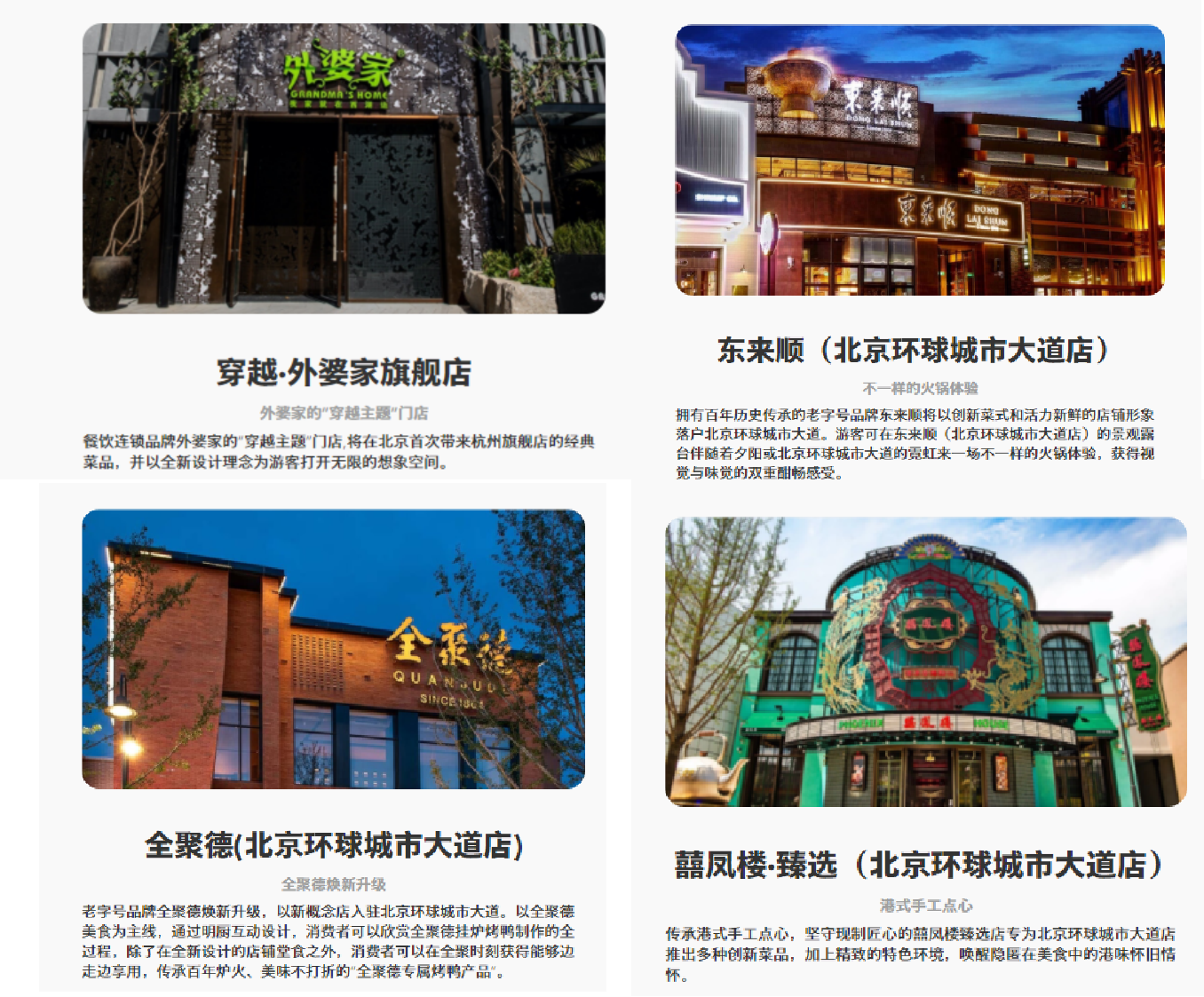 它們也在通過別具一格的店面設(shè)計(jì)和菜式融入“環(huán)球”氛圍,更迭品牌印象。例如餐飲連鎖品牌外婆家開設(shè)了北京“穿越主題”門店;北京全聚德、東來順,囍鳳樓臻選店則選擇創(chuàng)新菜式或產(chǎn)品招攬年輕人,其中全聚德還推出了DIY烤鴨的活動(dòng)。