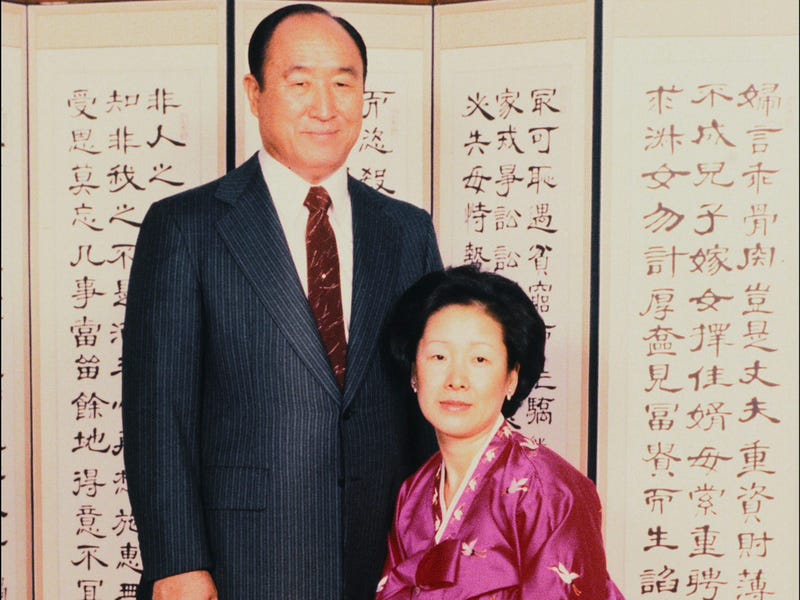 1947年,文鮮明因異端邪說被韓國(guó)長(zhǎng)老會(huì)開除,七年后他正式創(chuàng)辦“統(tǒng)一教”。1953年,他與第一任妻子崔元吉(Sun Gil Choi)離婚,理由是她無法接受他的教義。離婚七年后,他迎娶了他認(rèn)為的“女人”韓鶴子(Hak Ja Han),兩人被信徒們奉為潔凈人世的“真父母”,他們的親生孩子則被稱為“真子”。