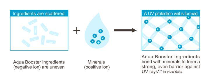 雖然也是用了w/o的配方,但是Aqua Booster的技術(shù)就是而且反其道而行之,當(dāng)皮膚上的防曬產(chǎn)品接觸到水以后,反而會(huì)增強(qiáng)對(duì)紫外線的吸收能力,提升程度達(dá)到20%,也就是說SPF50的產(chǎn)品在出汗以后,反而可以到SPF60